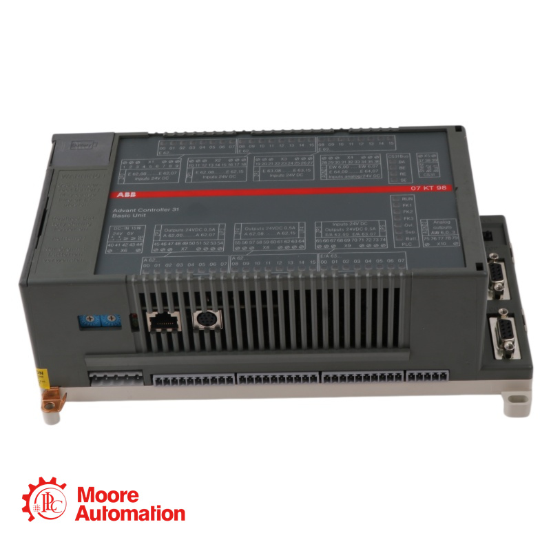 The ABB 07KT98-ETH GJR5253100R0270 is a compact and versatile Basic Module from the AC31 series, designed for decentralized and control applications requiring Ethernet TCP/IP connectivity. This programmable logic controller integrates extensive I/O capabilities directly onboard, featuring 8 configurable analog inputs, 4 analog outputs, 24 digital DC inputs, and 16 digital DC outputs, all within a single compact unit. With a fast instruction execution speed of 0.07 ms per 1000 instructions, 1 MB of user program memory. |