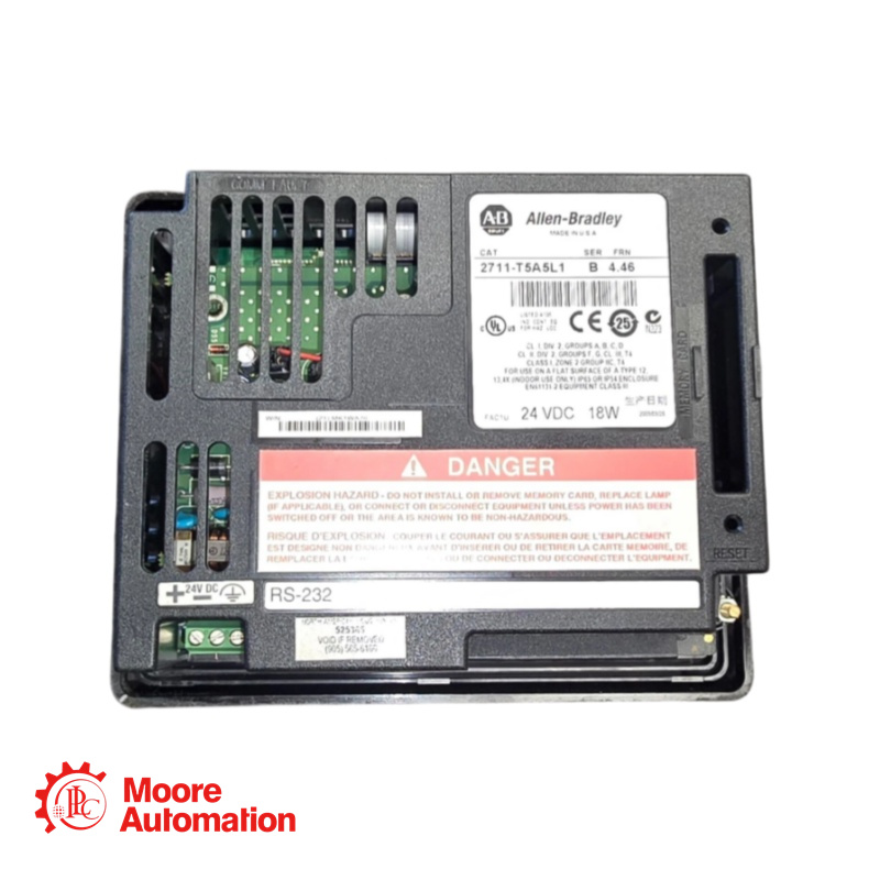 The PanelView 550 Standard Operator terminal with part number 2711-T5A5L1 is a 24VDC powered, DH485 enabled operator terminal that may be used to act as Human Machine Interface (HMI) device, permitting operation of an industrial process via the monochrome display and touch input interface.
