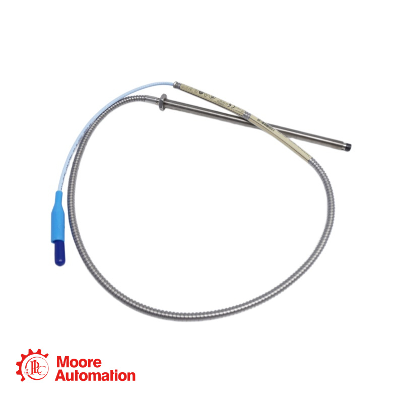 A: This is a Bently Nevada 3300 XL 8 mm proximity probe – a standard forward-mount probe with M10 x 1 metric thread, with flexible stainless steel armor. The specific configuration has 0 mm unthreaded length, 20 mm overall case length, 3.0 meter (10 ft) total length, standard cable with ClickLoc connector (no connector protector), and CSA/ATEX/IECEx hazardous area approvals.