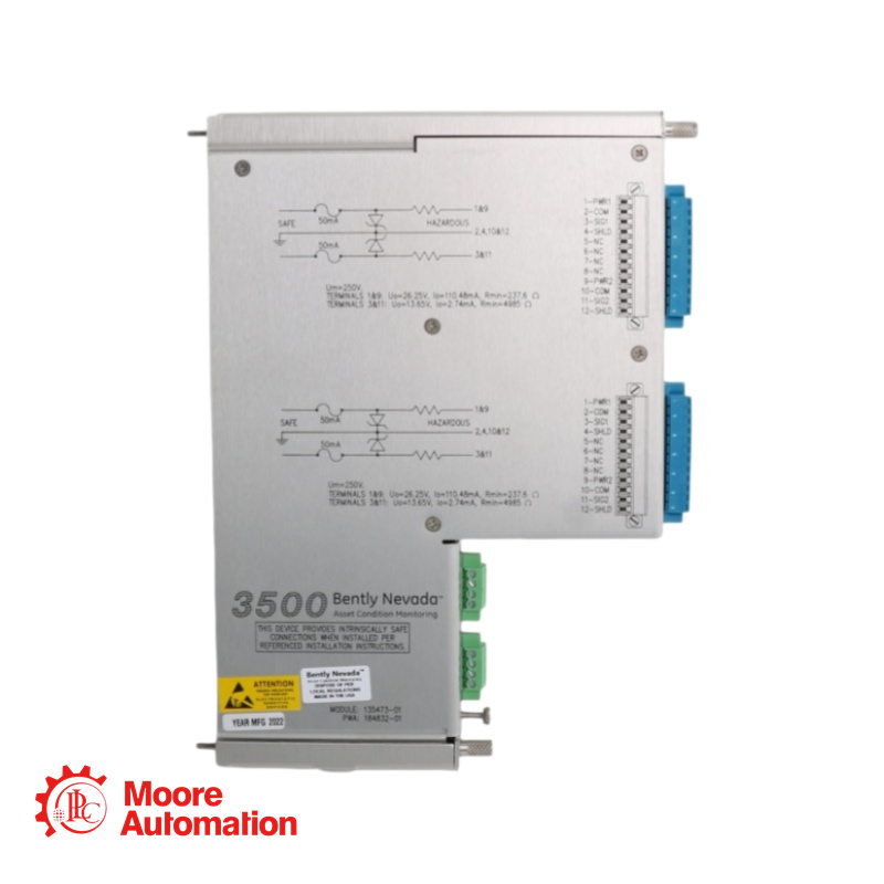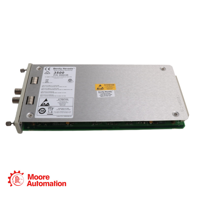 The Bently Nevada 3500/25 Enhanced Keyphasor Module isa half-height, two-channel module used to provide Keyphasor signals to the monitor modules in a 3500 rack. The module receives input signals from proximity probes or magnetic pickups and converts the signals to digital Keyphasor signals that indicate when the Keyphasor mark on the shaft coincides with the Keyphasor transducer. The 3500 Machinery Protection System can accept up to four Keyphasor signals for normal configuration and up to eight Keyphasor signals in a paired configuration.