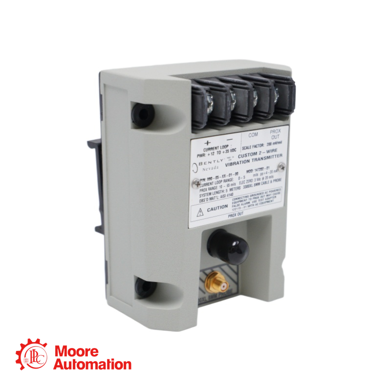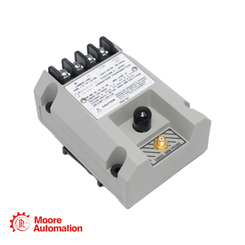 The 990-05-XX-01-05 MOD:165335-01 transmitter is a two-wire, loop-powered device that accepts input from our 3300 NSv proximity probe and its matching extension cable (available in 5 m and 7 m system length options).